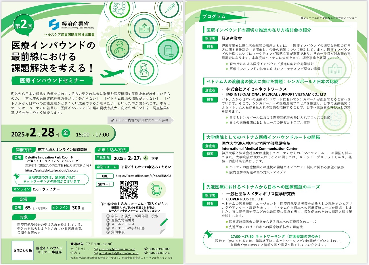 We will report on the Vietnam market research conducted by KOBE University Hospital and our partner organization (SMC Medical Tourism Japan Division) as part of the Ministry of Economy, Trade and Industry's FY2024 Healthcare Industry International Expansion Promotion Project.